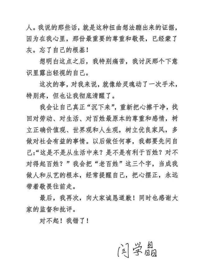 她说自己从小在普通家庭长大,能走到今天离不开生活的烟火气和父老乡亲。但她被捧久之后却忘了本,认为自己见了大世面有优越感,不知不觉就脱离了群众。 闫学晶还说,这次的事也算给她做了个灵魂手术,让她彻底清醒了,以后她会好好沉淀,改正自己的三观。