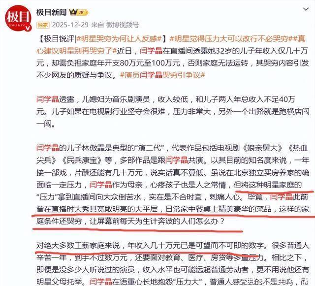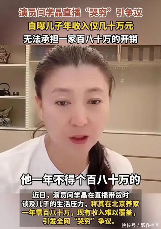 道歉时机太微妙,内容更显“不真诚” 12月30日,闫学晶在直播中向网友“吐苦水”,直言自己儿子拍戏一年才赚几十万,可家里一年运转得花百八十万,根本不够,所以还需要自己倒贴。