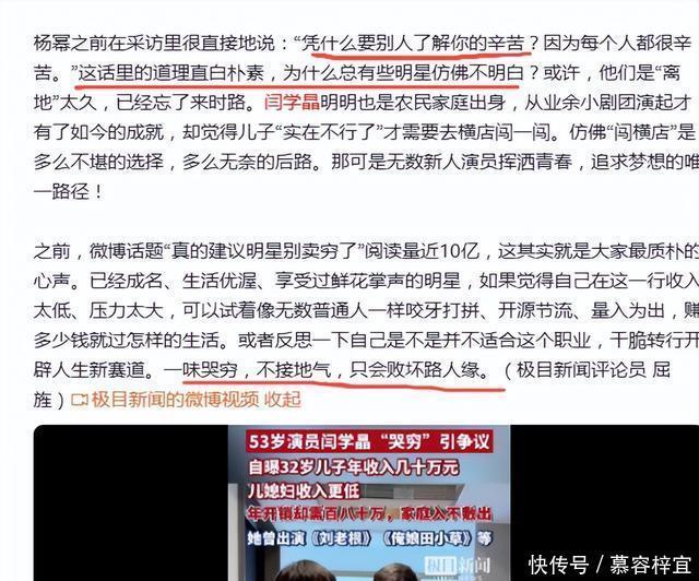 看到闫学晶家里装修的那么好,她还说自己有好几套房,家里一顿饭也是七八十来个菜,评论区瞬间被这番话给点燃了。 网友说: 对普通人来说,年入几十万已是遥不可及的目标,闫学晶身为明星、条件这么好,哭穷哭的也太没道理了吧? 风波发酵后,不但网友怒斥,不少官媒也发文点评了这件事,批评起来也是毫不留情,说: 一味哭穷,不接地气,只会败坏路人缘。 但不管外界怎么评论,闫学晶却始终沉默不语。
